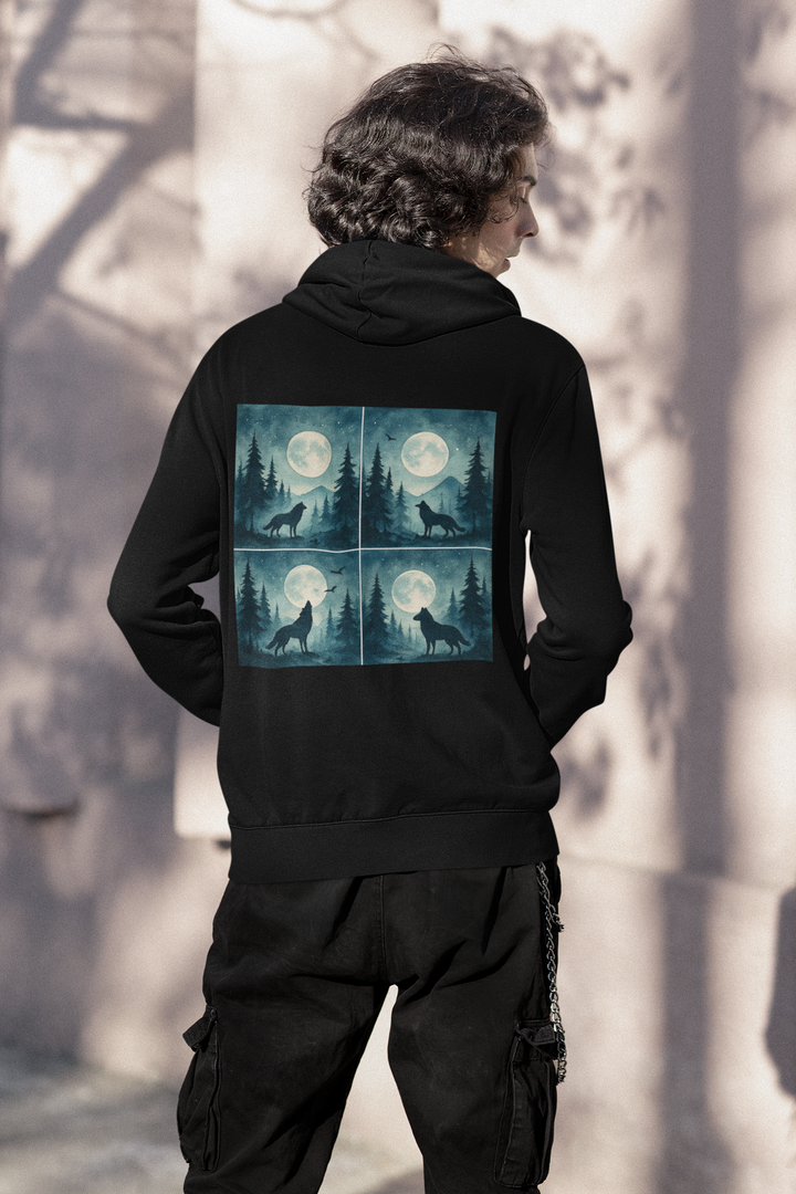 Mystic Wolf Moon Forest Hoodie – Men’s Artistic Night Sky Wilderness Pullover